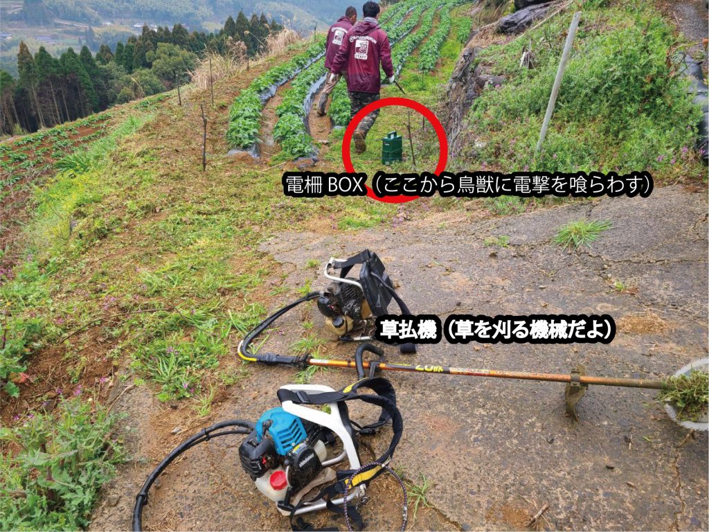 【写真奥】・・・緑の箱が電柵BOX!これに電柵をつないで、畑を囲みます。イノシシの侵入を防ぐバリケードになるんですね。(触れたら電気ショック!!!) 【写真手前】・・・草払機です。昔は鎌(かま)でしたが、最近はこれのお陰で楽に草を刈れます!