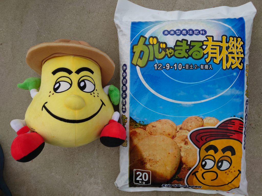 次にとっておきの肥料!がじゃまる有機です。作物の成長に必要な3大栄養ちっ素(葉を大きく)・リン酸(実を大きく)・加里(根をはる力)に加え、苦土に動植物性の肥料(収穫までじわじわ栄養を与え、じゃがいもをおいしくする)が入っています。全体的にバランスのよい肥料です☆これも土によく混ぜます。(手はトラクターです)